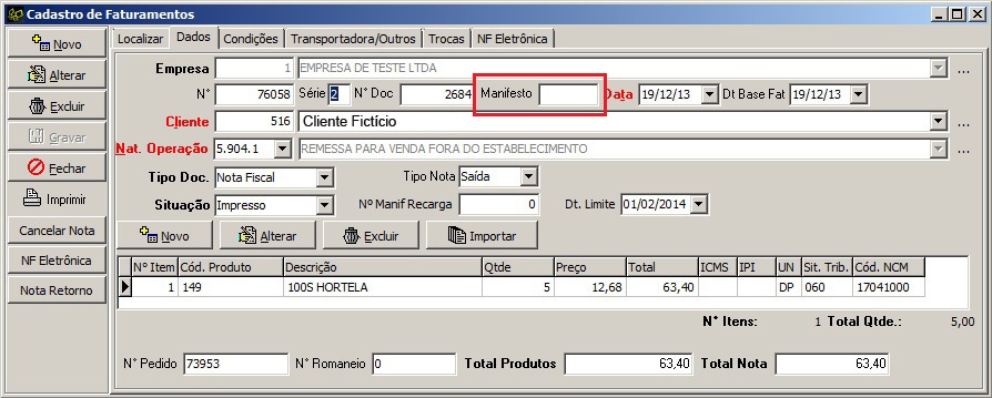Na tela de faturamentos, quando o cliente possui um manifesto (que deveria estar em verde) mas o encontra como uma nota fiscal de venda (em amarelo). Com isso, não é possível gerar nota de retorno e fazer o fechamento do manifesto.
