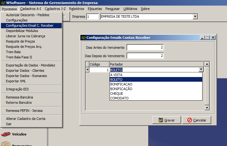 3.2 Portador: O processo pode ser configurado para que seja disparado e-mail para contas a receber com outros portadores, não apenas “Boleto”.