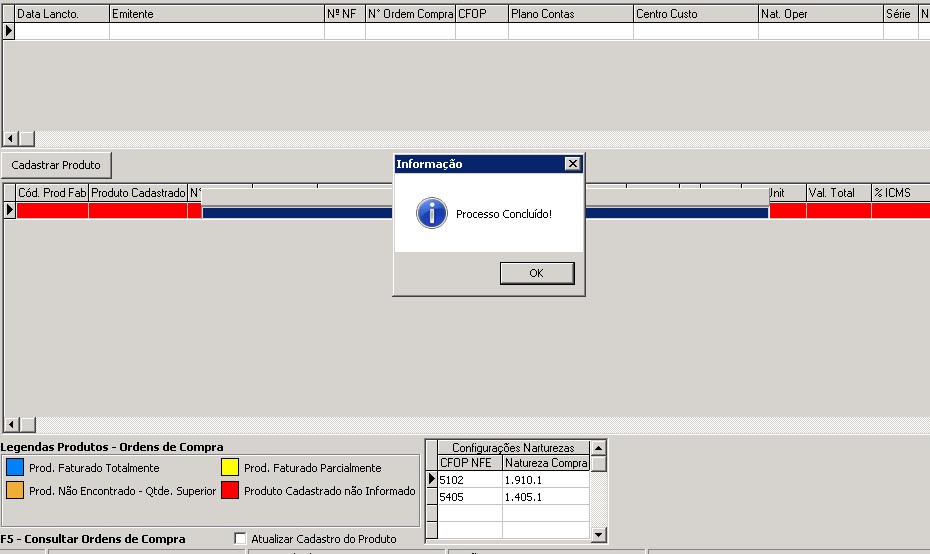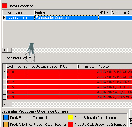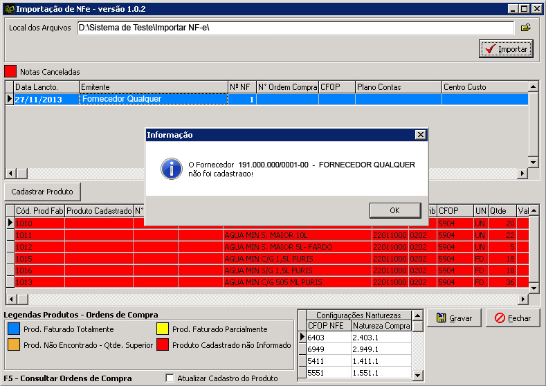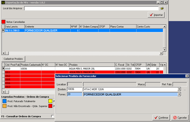 Ao dar duplo clique em qualquer produto que está em vermelho, o sistema identifica se o fornecedor existe. Se não existe, ele deverá ser cadastrado (basicamente) com os dados que constam na nota ou com as informações prestadas pelo próprio fornecedor.