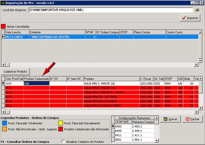 Para vincular o produto do fornecedor ao Seu produto do Gestão WMC, basta dar um “duplo clique” no produto que está em “VERMELHO”. Todos os produtos em vermelho não foram identificados pelo Gestão WMC e devem ser vinculados a um produto cadastrado no sistema.