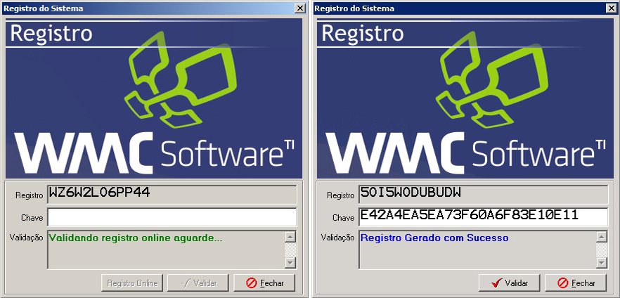 Desta forma, clicando no botão REGISTRO ON-LINE, o sistema fará automaticamente uma conexão com o nosso servidor e irá gerar uma nova chave de registro. a imagem abaixo ilustra o processo: