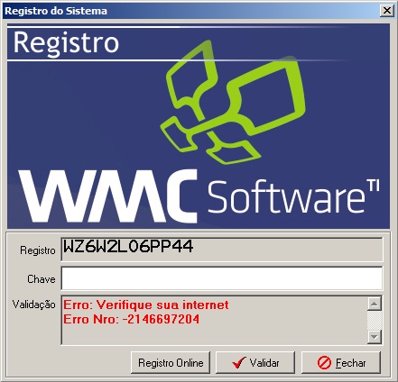 Se o processo falhar, será exibida uma mensagom ao usuário. Nste caso por exemplo, um problema de internet foi identificado. Para outros casos de erro, entre em contato com o Suporte WMC: