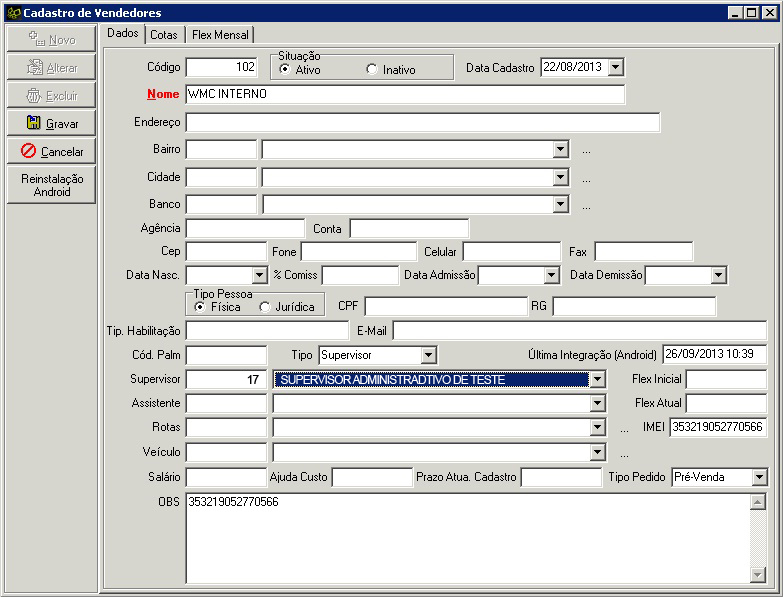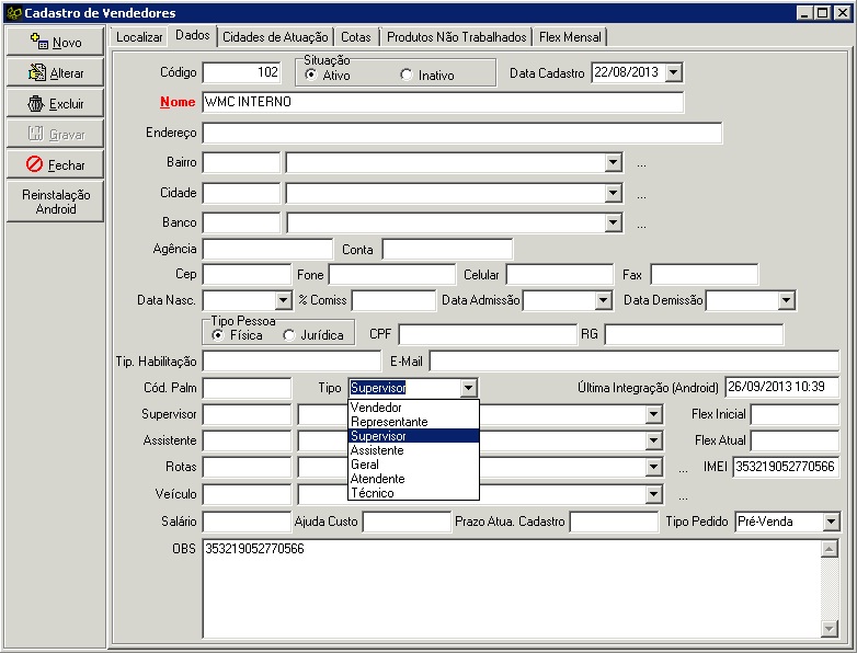 IMEI: Este número é a identificação do aparelho que utiliza o Android. Através deste campo, o Gestão WMC pode “encontrar” o aparelho do Vendedor, identificá-lo e trocar informações (integração);